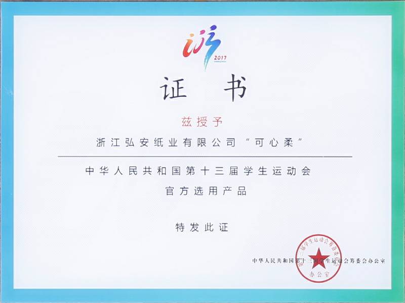 2017年9月4日中华人民共和国第十三届学生运动会在浙江杭州举行,可心柔携手中国邮政、中国平安、娃哈哈、京东校园、吉利汽车等知名企业品牌亮相大会。作为本次大会的12家合作单位之一,浙江华体在线体育(中国)官方网站纸业有限公司参加了发布会,并接受了官方选用产品的授牌。